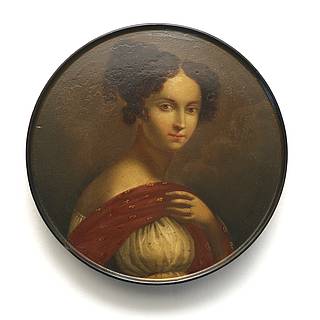 Runde Dose mit junger, den Betrachter über die Schulter anblickender Schönheit mit Lockenfrisur, Schultertuch und kurzem Puffärmel. Neutraler Hintergrund.