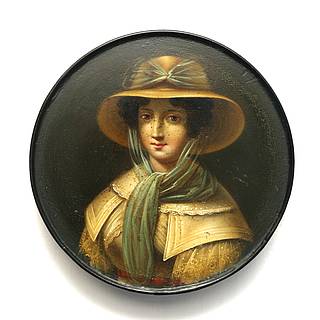 Runde Dose mit Bildnis einer jungen Frau mit großem Strohhut und unter dem Kinn gebundenem Schleier und hochgeschlossenem Festtagskleid mit doppeltem Kragen und gebauschten Ärmeln. Neutraler Hintergrund.