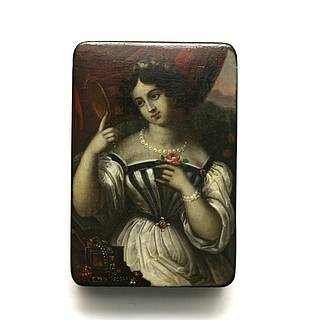 Rechteckige Dose mit junger Schönheit im Festkleid, Rosenkranz im Haar, Perlenkette, Armband, Rose in der linken und Handspiegel in der rechten Hand. "Die triumphierende Rose". Neben ihr geöffnete Schmuckschatulle, hinter ihr geraffter Vorhang, der den Blick in eine Landschaft freigibt.