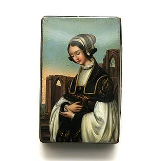 Rechteckige Dose mit einer jungen Kirchgängerin in festlicher Kleidung und Gebetbuch vor dem unvollendeten Kölner Dom. Malerei nach der Lithographie "Die Kirchgängerin" von P. Avanzo (Lebensdaten unbekannt) nach einem Gemälde von Louis Emy Blanc (1810-1885). Anmerkung: Das Originalgemälde befindet sich im Rheinischen Landesmuseum in Bonn, eine eigenhändige Replik in der Landesgalerie Hannover.