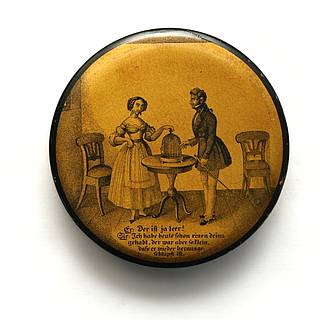 Runde Dose mit einer Radierung auf Goldgrund. Junges Biedermeierpaar vor leerem Vogelbauer auf einem Tisch im Zimmer. Beschreibung der Szene unter der Darstellung.