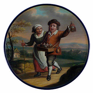 Runde Dose mit einem wandernden Apotheker mit Medizinflaschen und einer Weggefährtin mit Wanderstab in einer Landschaft. Malerei nach einer Vorlage von David Teniers (1610-1690).