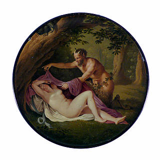 Runde Dose mit erotischer Szene im Wald. Antiope, Tochter des thebanischen Herrschers Nykteus, wird von Zeus, in Gestalt eines Satyrn, entschleiert. Im Baum in einer Astgabel der Adler des Göttervaters.