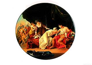 Runde Dose mit einer Szene aus Paul de Rapins "Histoire d´Angleterre". "Eleonora saugt das Gift aus der Wunde ihres Gemahls Edward I." nach einer Stichvorlage von William Wynne Ryland (1732-1783) nach Angelika Kauffmann (1741-1807).