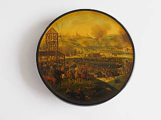 Größere, runde Dose mit außergewöhnlich detailreicher Darstellung eines Gefechtes im Rahmen der sogenannten Koalitionskriege. Das Schlachtfeld von Valmy am 20. September 1792. Im Vordergrund auf dem "Feldherrnhügel" der französische General Kellermann (Duc de Valmy) mit seinem Stab, daneben die legendäre Windmühle, im Hintergrund die Stadtsilhouette von Valmy.