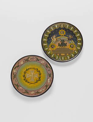 Runde Dose, sog. "Friedensdose" zur Erinnerung an die Völkerschlacht bei Leipzig 1813. Auf dem Deckel: Allegorie auf die Koalition zwischen Preußen, Rußland und Österreich. Im Zentrum das Brandenburger Tor mit Quadriga. Unter diesem Schriftzug "VICTORIA BORUSSIAE". Über dem Monument ein Regenbogen, in dem Europa auf dem Stier sowie Friedrich II. von Preußen auf einem Adler schweben. Darunter und darüber in Sternen: Friedrich Wilhelm III. von Preußen, Alexander I. von Rußland sowie Franz II. von Österreich (Heilige Allianz). Rundumlaufend die Porträts der "Befreier Europas". Auf dem Boden in Lorbeer- und Strahlenkranz: Das am 10. März 1813 von Friedrich Wilhelm III. gestiftete "Eiserne Kreuz" mit Aufschrift: "GERMANIA SIBI REDDITA DIE XVIII OKTOB: MDCCCIII." Im äußeren Medaillonrahmen Symbole der Wissenschaft und Kunst. Darstellungen nach Entwürfen von Louis Catel (1776-1819).