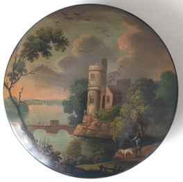 Kleine, runde Dose mit einfacher Landschaftsmalerei. Burgruine mit Wanderer und Hündchen am Fluß. Anmerkung: Dosen dieser Art führte die Manufaktur Stobwasser in ihren Preis-Courants jeweils im Dutzend zu relativ niedrigen Preisen auf.