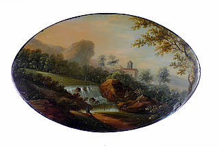 Ovale Dose mit einer Phantasielandschaft mit Wasserfall und Angler.