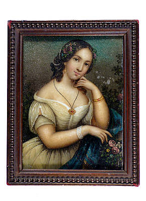 Miniatur-Gemälde mit einer jungen Frau mit dekolletiertem Kleid, Schultertuch, Blumen und Perlkette im Haar sowie Blumenbouquet im Freien.