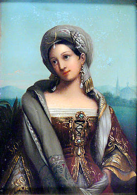 Miniatur-Gemälde mit junger Orientalin mit besticktem Gewand, Turban mit Halbmond und Perle sowie Tropfenperlohrringen und Stola. Im Hintergrund Landschaft mit Moschee.