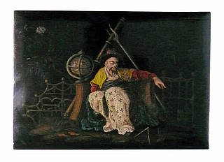 Rechteckige Spieleschatulle mit vier mit spielenden chinesischen Kindern bemalten Jetondosen im Innern. Auf dem Deckel: Vielfarbig gekleideter Chinese mit Weltkugel, Zirkel und Fernrohr auf einer Gartenbank im Freien.