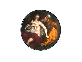 Runde Dose mit einer Darstellung aus dem Alten Testament. Die ihre Blöße mit Tüchern verhüllende babylonische Jüdin Susanna im Bad, bedrängt von den "beiden Alten" mit Turbanen. Malerei nach einer Vorlage von Guido Reni (1575-1642).