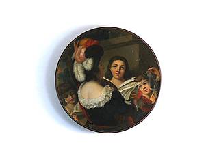 Runde Dose mit vier musizierenden Personen im Freien. Im Vordergrund Rückenansicht einer Dame mit Straußenfedern am Hut und Rüschen am Rückendecolleté. Dahinter drei Kinder mit Notenblättern bzw. Triangel.