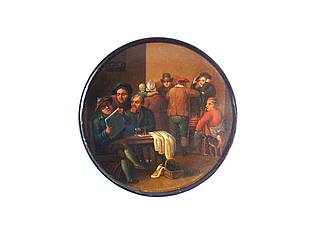 Runde Dose mit sieben debattierenden, bäuerlichen Niederländern sowie einer Frau mit Kind auf dem Arm sowie einem Hund. Malerei nach einer Vorlage von David Wilkie (1785-1841).