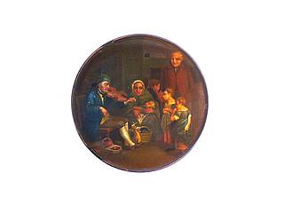 Runde Dose mit einer Interieurszene. Ein blinder, auf einem Stuhl sitzender alter Mann spielt einer sechsköpfigen Familie in einer Kammer auf der Violine vor. Malerei nach einer Stichvorlage von John Burnet (1781-1868) nach dem Gemälde "The Blind Fiddler" von David Wilkie (1785-1841). Anmerkung: Das Originalgemälde befindet sich heute in "The Tate Gallery, London".