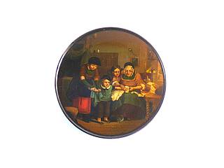 Runde Dose mit einer Interieurszene. Die Großmutter versorgt den verletzten Finger des kleinen Knaben, die Mutter hält dessen andere Hand mit dem Messer und der Bruder sieht interessiert zu. Malerei nach einer Vorlage von David Wilkie (1785-1841).