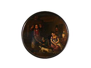 Runde Dose mit einer Jagd von Vater, Mutter, Kind und Hund (Rat Killer) auf eine Maus. Im Hintergrund; die durch den Türspalt blickende Großmutter. Malerei nach einer Druckvorlage von John Burnet (1784-1868).