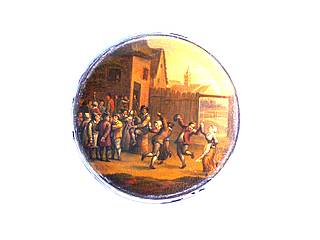 Runde Dose mit ausgelassen tanzenden und feiernden Bauern. Im Hintergrund hinter einem Lattenzaun Häuser und Kirche.