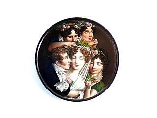Runde Dose mit einer Kopfassemblage mit jungem Brautpaar und drei Brautjungfern mit Rosen im Haar.