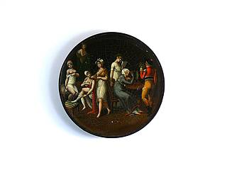 Runde Dose mit einer Szene im Bordell. Sechs freizügig gekleidete Frauen, die Besuch von einem jungen Mann im Reitdress mit Blumenstrauß erhalten. Malerei nach der Vorlage "Le Lever des Ouvrières en Linge" von Jean-Francoise Bosio(1764-1827).