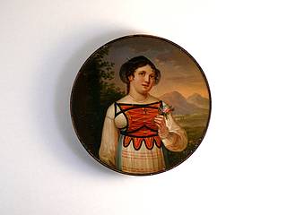 Runde Dose mit Bildnis einer jungen Frau in Schweizer Tracht mit geschnürtem Mieder, Haube und kleinem Blumenstrauß in der Hand. Im Hintergrund Berglandschaft und Fluß.