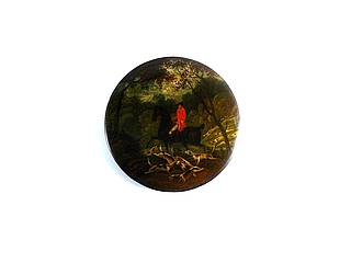 Runde Dose mit einer Jagdszene. Pferd mit Reiter in rotem Jagdrock und Hundemeute im Wald. Innen unter Klarlack goldfarben.