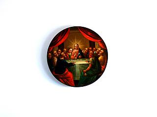Runde Dose mit Christus mit Strahlenkranz und seine zwölf Jünger beim Abendmahl am Tisch unter gerafftem Vorhang.