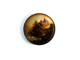 Runde Dose mit einer Fluß- und Berglandschaft mit Blick auf Schloß Ringenberg. Im Vordergrund Personen; auf dem Fluß weitere Personen in einem Boot.