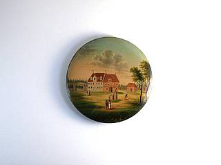 Runde Dose mit einer Landschaft mit Personenstaffage. Im Zentrum ein Landgut mit Beihaus. Im Vordergrund ein Brunnen sowie zwei Bäume.