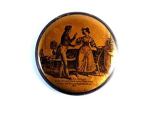 Runde Dose mit einer Radierung auf Goldgrund. Biedermeierliche Szene mit junger Frau im Wohnzimmer eines jungen Zahnarztes. Unter der Darstellung zweideutiger, erotischer Text.
