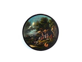 Runde Dose mit einer Felslandschaft mit zahlreichen rastenden Bauern mit ihrem Vieh. Im Hintergrund dramatische Wolkenbildung.