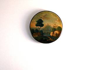 Kleine, runde Dose mit einfach gemalter Berglandschaft mit Personenstaffage. Im Zentrum höherer Berg mit Burg.