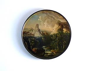 Runde Dose mit einer syrischen Landschaft mit Fluß und bizarren Bergen. Im Vordergrund getreppter Ablauf des Flusses Nahrquadres, auch Heiliger Fluß genannt. Himmel mit starker Wolkenbildung.