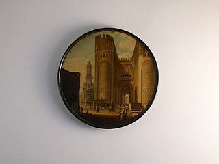 Runde Dose mit einer Stadtansicht von Kairo. Im Vordergrund großes, gemauertes Stadttor mit zwei Türmen mit Zinnen. Davor zahlreiche Personen sowie mehrere Kamele. Links Blick in eine Straße.