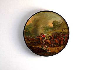 Runde Dose mit einer Schlachtenszene mit zahlreichen Soldaten und Pferden aus den Türkenkriegen. Im Vordergrund gefallene und auf Pferden fliehende Türken. Dahinter Pulverdampf.