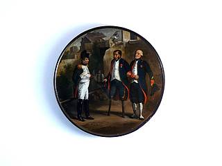 Runde Dose mit Napoleon und zwei Veteranen aus der Schlacht von Austerlitz. Im Hintergrund zerstörte Häuser sowie zwei weitere Männer, von denen einer mit der Spitzhacke arbeitet.