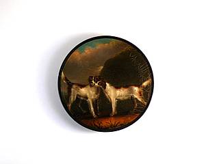 Runde Dose mit zwei sich beschnüffelnder, zueinander stehender, gescheckter Jagdhunde in Seitenansicht in einer Landschaft mit Bergmassiv.