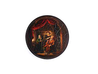 Runder Dosendeckel mit einer Interieurszene. Der Zahnarzt zieht dem Patienten in einem boudoirartigen Raum einen Zahn. Im Hintergrund sieht eine ältere Frau dem Treiben zu.