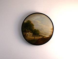Runder Dosendeckel mit einer Landschaft mit Personenstaffage. Links vorne vor größerer Baumgruppe ein Fachwerkhaus. Im Hintergrund vor Bergkulisse ein See mit Boot.