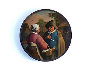 Runder Dosendeckel mit einer Marktszene. Bauersfrau mit Einkaufskorb und älterer Mann mit Schlapphut und Tabakspfeife bei der Unterhaltung am Marktplatz. Malerei nach einer Vorlage von Adriaen van Ostade (1610-1684).