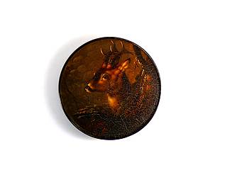 Runder Dosendeckel mit Kopf eines jungen Rehbocks vor wolkigem Hintergrund.