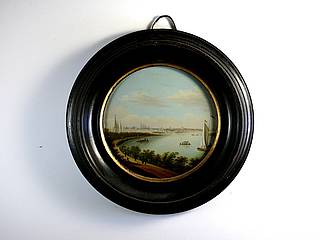 Runder Dosendeckel mit Blick über den Rhein auf Bonn. Im Vordergrund Weg mit Büschen und Bäumen sowie Personenstaffage. Auf dem Fluß mehrere Boote. Im Hintergrund die Stadtsilhouette. Späterer Rahmen.