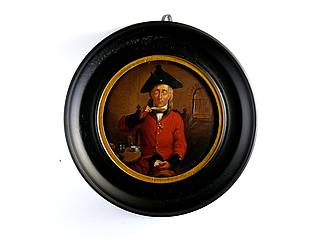 Runder Dosendeckel mit einem Pensionär des "Royal Hospital" in London- Chelsea beim Teetrinken am Tisch. Späterer Rahmen.