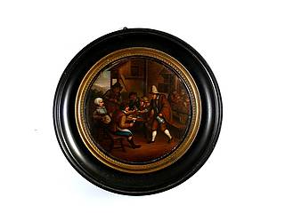 Runder Dosendeckel mit fröhlich feiernden und Karten spielenden Niederländern vor einem Haus. Im Hintergrund Landschaft. Malerei nach einer Vorlage von David Teniers (1610-1690).