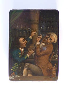 Rechteckige Dose mit humorvoller Darstellung eines Zahnarztes, der seinem Patienten mit heißem Kaminbesteck zuleibe rückt. Im Hintergrund Regale mit medizinischen Flaschen. Im Vordergrund auf einem Tisch ein Mörser sowie Behandlungsutensilien.