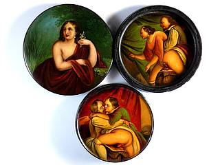Runde Dose mit doppeltem Boden mit erotischer Malerei. Auf dem Deckel: Junge Schöne mit Schultertuch und Rose im Schilfgras. Im doppelten Boden auf Ober- und Unterseite: Erotische Darstellungen zweier Paare in Boudoirs.
