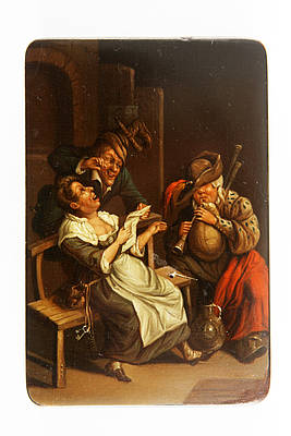 Rechteckige Dose mit humorvoller Szene. Musizierende, flämische Bauern. Auf einer Bank sitzende Frau mit Notenblatt. Hinter ihr ein ebenfalls singender, gestikulierender Mann. Neben den beiden kurios gekleideter Dudelsackspieler mit großem Hut. Am Boden ein Weinkrug. Malerei nach einer Vorlage von Adriaen van Ostade (1610-1684).