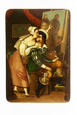 Rechteckige Dose mit Atelierszene. Der Maler Antonis van Dyck (1599-1641) mit Malpalette und junger Frau ( Mätresse) vor der Staffelei im Atelier.