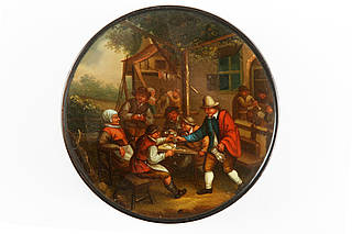 Runde Dose mit Karten spielenden, zechenden, rauchenden und musizierenden Niederländern vor einem Wirtshaus mit bewachsener Pergola. Malerei nach einer Vorlage von Adriaen van Ostade (1610-1684).