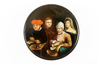 Runde Dose mit einer Szene beim Notar. Junge Braut und älterer Mann beim Aushandeln des Ehevertrages in der Schreibstube des Notars. Hinter dem Schreiber ein junger Möch mit Tonsur beim hinterlistigem Blickaustausch mit der Braut. Malerei vermutlich nach einer Vorlage von Cornelius Begas (Lebensdaten unbekannt).